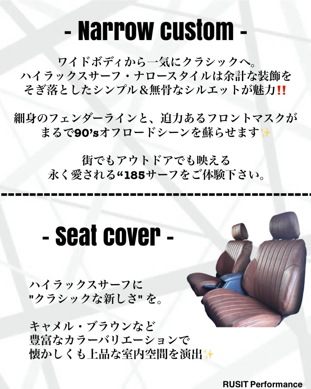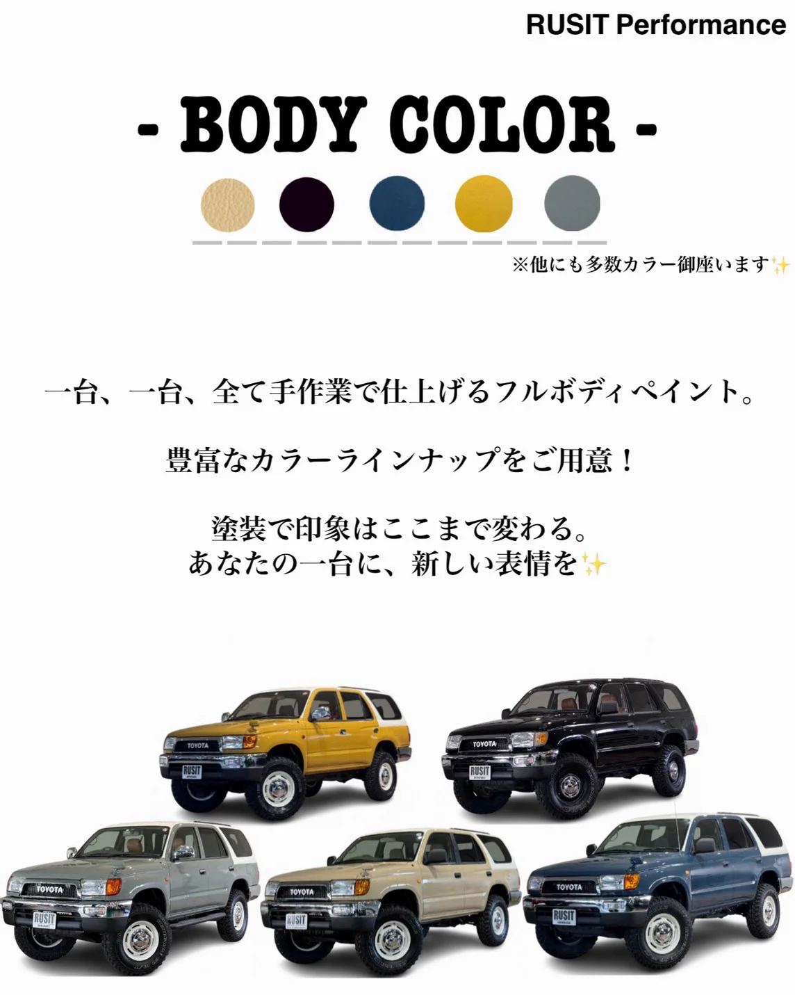 4WD・SUVの足回りやアフターパーツ、自社鈑金工場によるオールペイント等のカスタムを得意としております。
